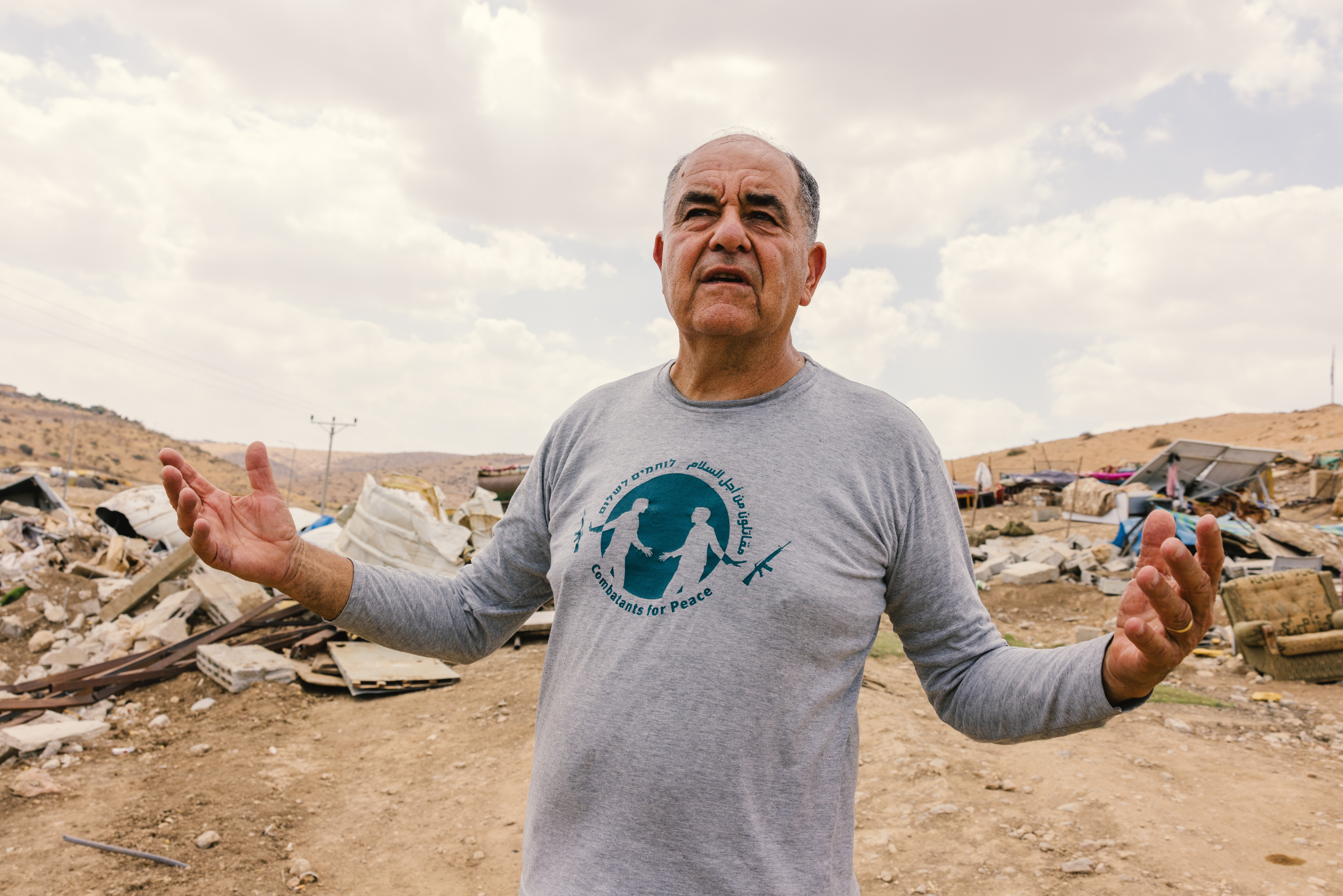 Elie Avidor, a former Israeli soldier, battle-hardened in the Yom Kippur war, now stands at my side beneath a brutal sun in an arid desert town north of the Jordan Valley. The chalky air drags across the jagged, pink landscape pulled by a steady, merciful breeze as half a dozen Israeli flags snap and shred on most anything standing tall. The flags are a taunt, a threat, staked by settlers who reject and daily undermine the international consensus, grounded in U.N. Resolution 242, that this territory is not part of Israel’s sovereign land but is Palestinian territory under international law. We are here to meet the people of the land—the multiple generations of farmers with their wives, children, herds, and flocks.