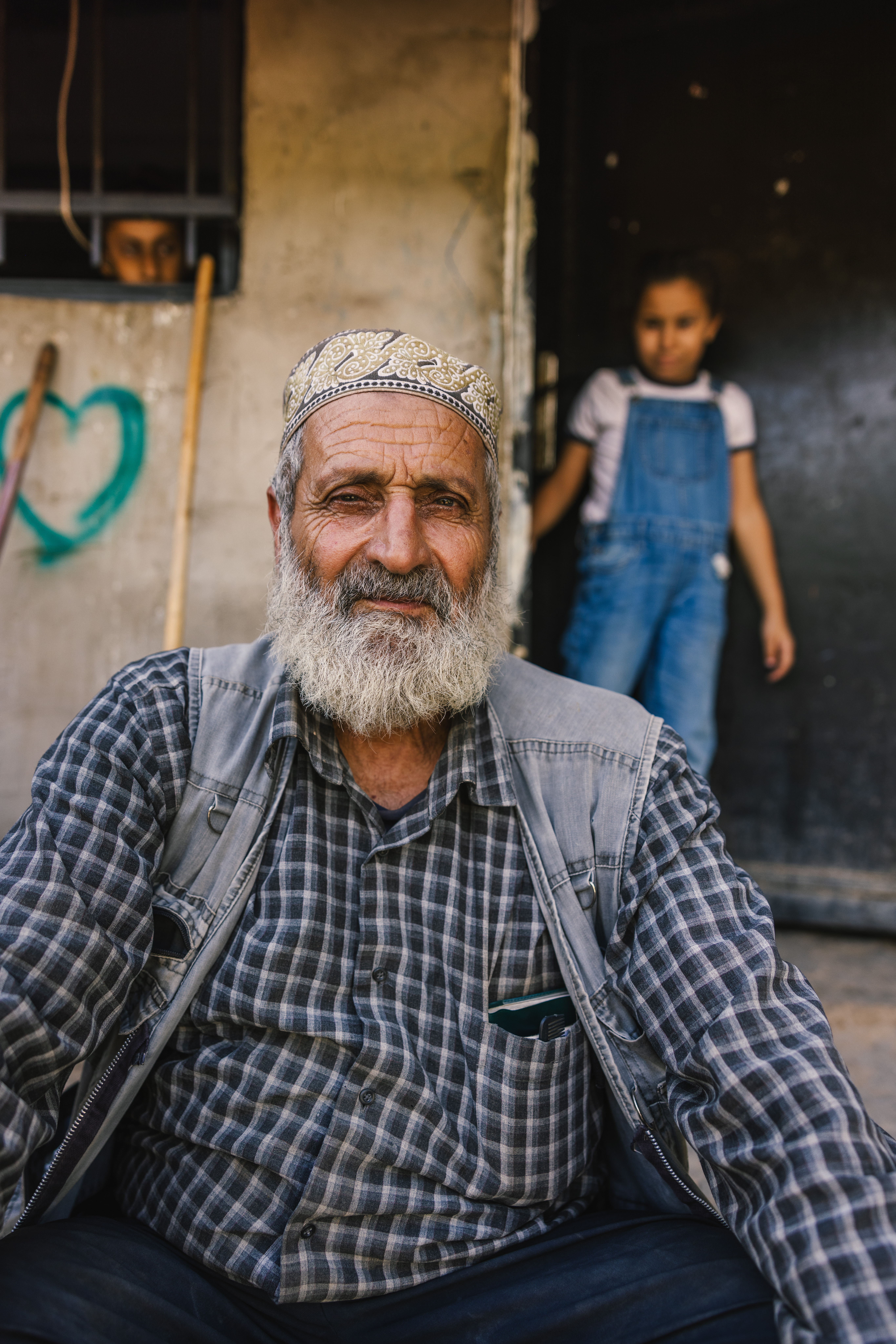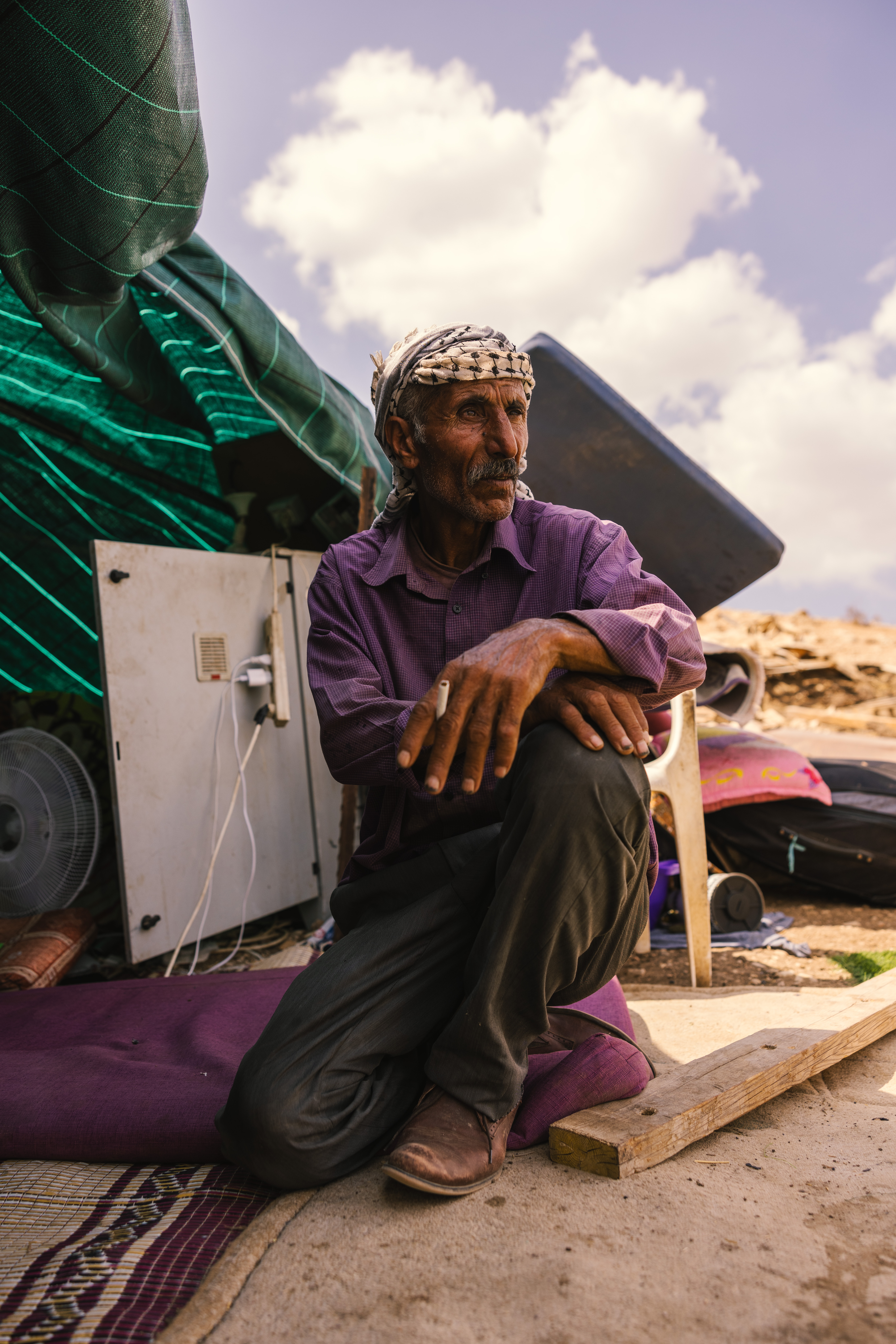 “Come,” says Elie, “talk to the people,” waving a hand toward piles of rubble, toppled cinder blocks, twisted plastic water barrels, dismembered furniture, a restless, dry-mouthed donkey, and a withering tarp stretched to create a shard of shade. He introduces our host, Farsiy, an elderly Palestinian farmer born here where we’re standing—his life’s work and investments lie tossed, mangled, and strewn around us. The place is called Al-Hulwa (meaning sweet in Arabic), an apt description of what used to be, perhaps, but not at all reflective of the hell they’re living through. “Every day is harder than the one before,” Farsiy’s son tells me.