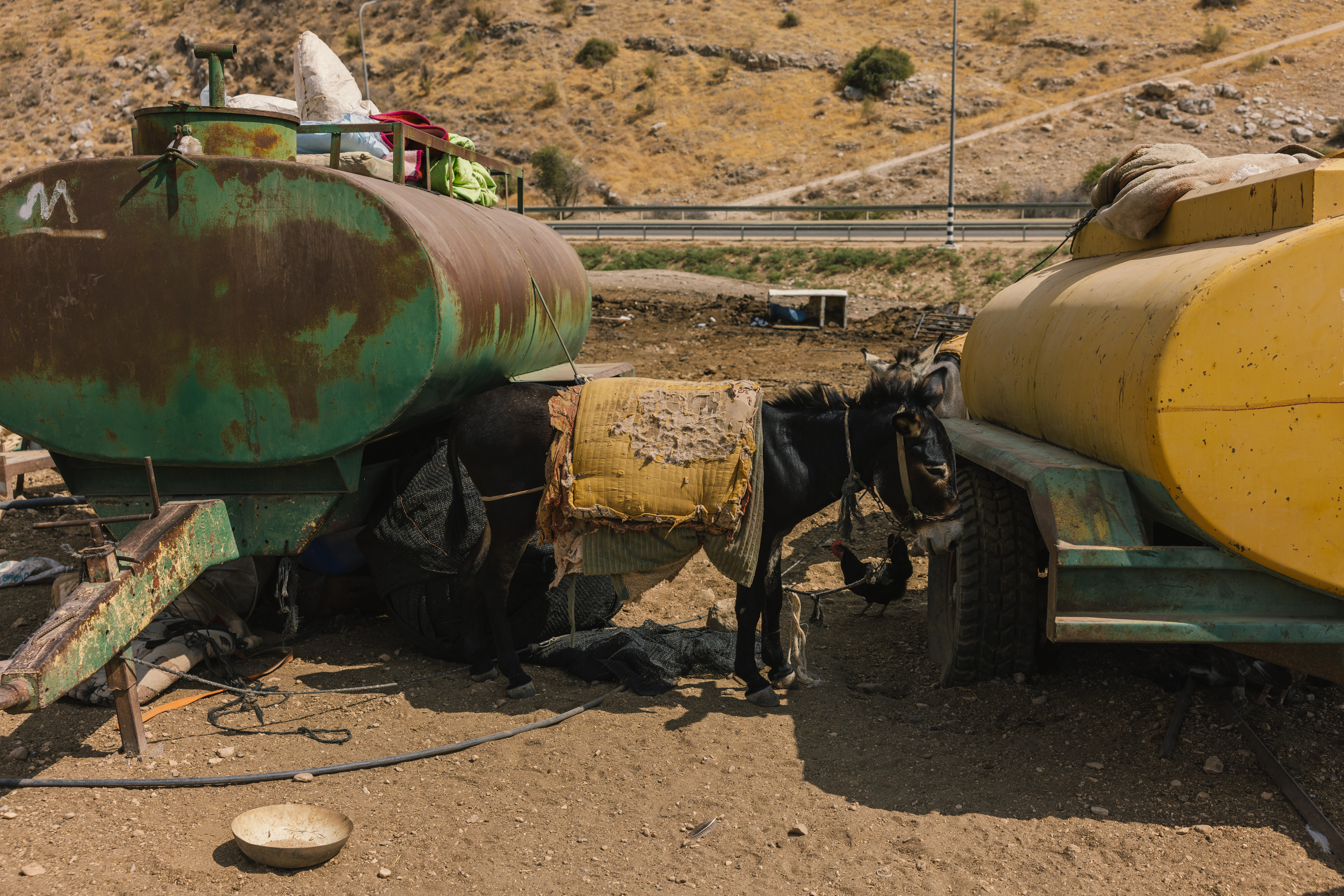 (Left) Farsiy, an elderly Palestinian farmer born in Al-Hulwa, an arid desert town north of the Jordan Valley. (Right) Farsiy's donkey rests between trailers.