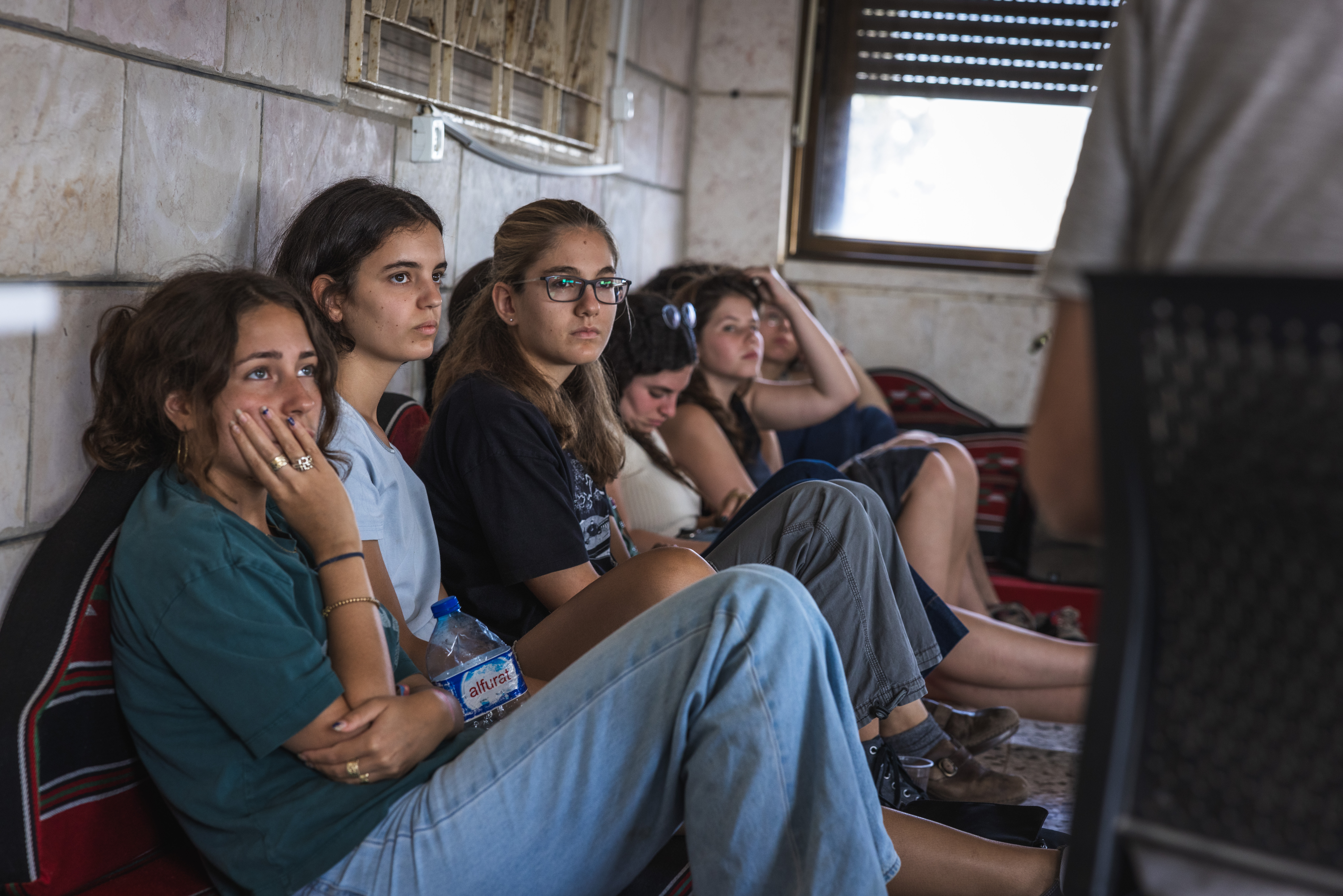 Just before I spoke with Avner, CfP hosted one of its educational programs, the Israeli Freedom School, for a film screening of There Is Another Way in the office. This cohort of 15-20 young Israelis ages 18-24 traveled to the West Bank—some for the first time in their lives—to learn about nonviolence and hear different narratives. Asked what she imagined the West Bank would be like, one student tells me, “a war zone.” Her admission and sincerity is touching, though immediately calls into question her choice of footwear. Nonetheless, she’s here to learn. The office is rearranged into rows of seats facing a projector screen pulled low across the windows on the far wall. As light snaps to dark, I feel the students brace themselves. Tears roll as the moments of that infamous morning unfold through bodycam footage and cell phone recordings between loved ones locked in safe rooms, gunfire giving way to grenade blasts. “Mom, are you okay?? … MOM???” the subtitles read. Gentle pats on the leg, the students’ only discernible movements.