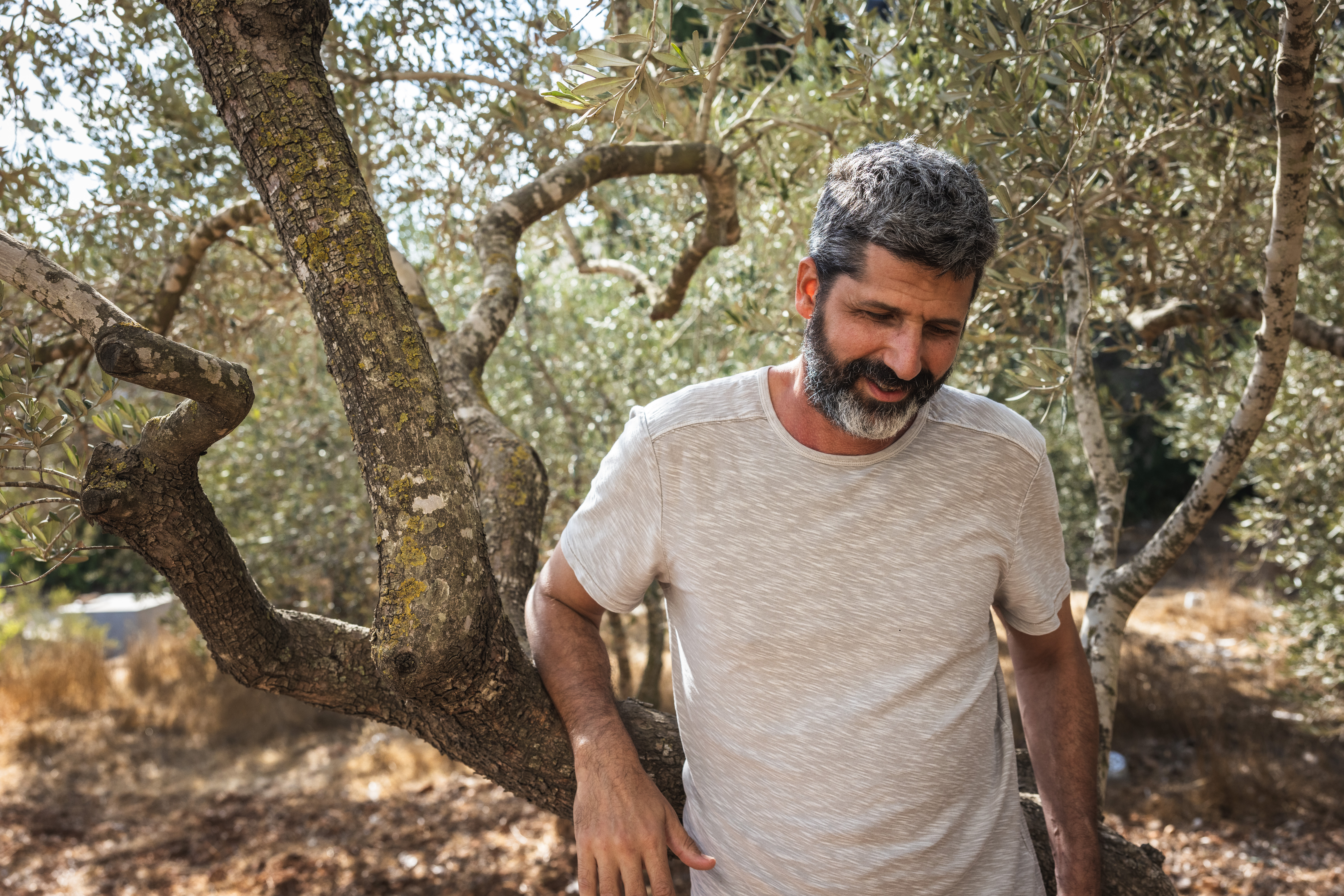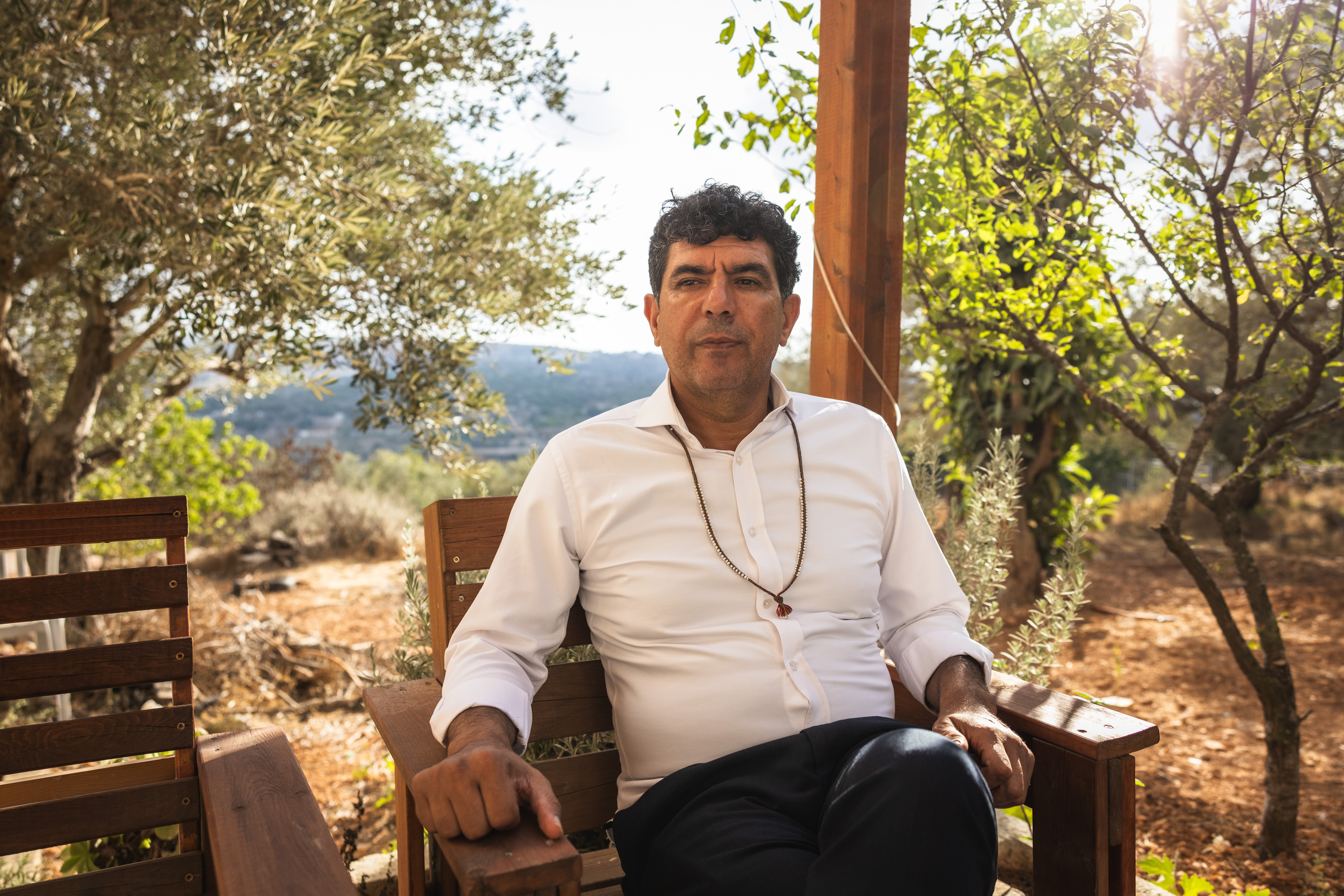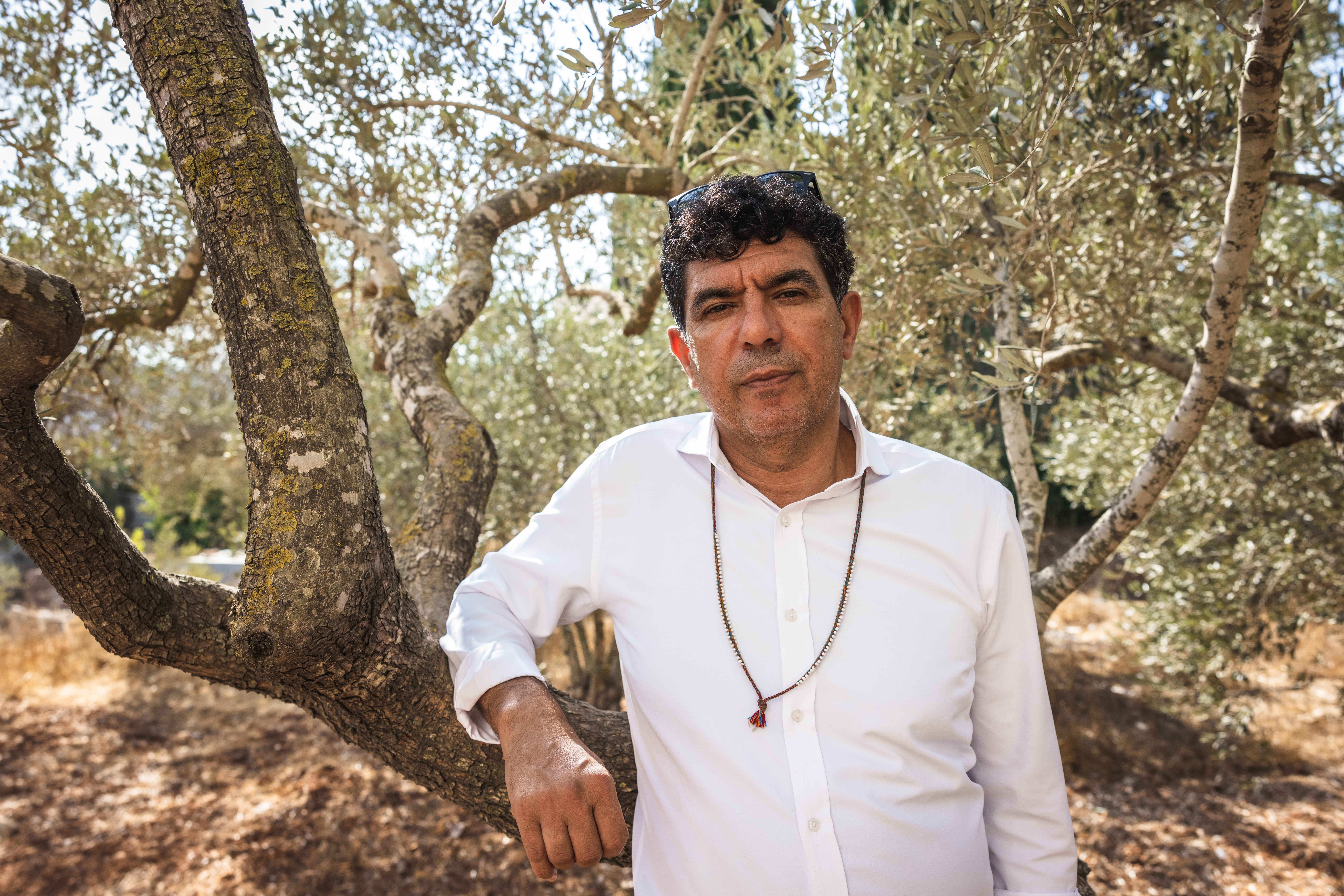 Sulaiman Khatib, co-founder of Combatants for Peace, poses for a portrait beneath an olive tree in the side yard adjacent to the CfP office in Beit Jala.