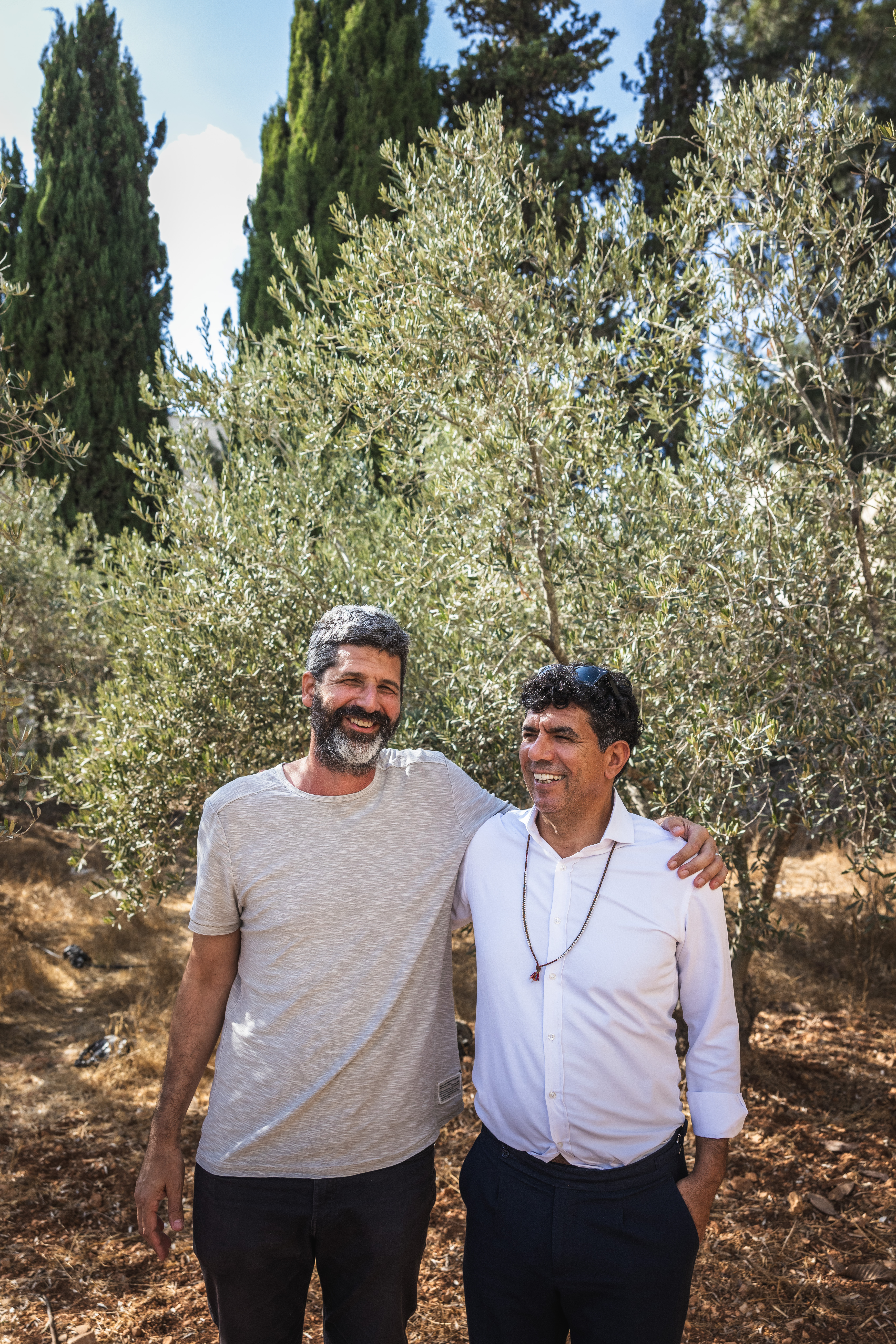 (Left) Rana Salman, Palestinian co-director of Combatants for Peace, poses for a portrait by an olive tree beside their offices. (Right) Avner Wishnitzer, a professor of history at Tel Aviv University and co-founder of Combatants for Peace poses for a portrait with another Combatants for Peace co-founder, Sulaiman Khatib.